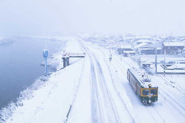 | 中之口川の堤防に沿って列車は走る。 この日は雪が降り続き、辺りの田んぼも民家の屋根も白色1色に覆われていた。 |