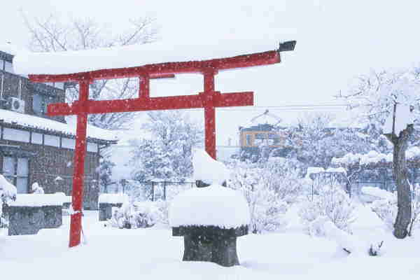 | 銀世界の中ひときわ目立つ日枝神社の真紅の鳥居。60年以上もこの鳥居は、新潟交通の電車をずっと見守ってきました。 |