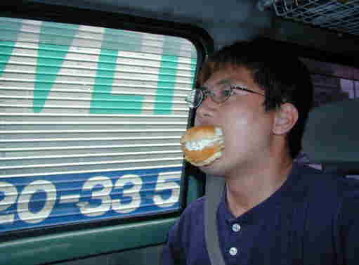 | お腹が空いてもゆっくり休んで食べる時間もありません。なんせ九州の長崎まで1200km余りあります。仕方がないのでパーキングの自販機でハンバーガーを買って、食べながらの運転です。 |