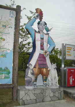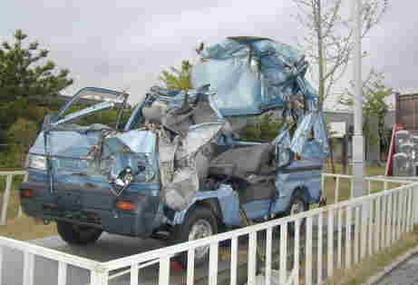 | 岡山県にある山陽自動車道 吉備S.A までこぎつけました。 さすが吉備の国、桃太郎のハリボテがありました。 しかしその隣りに何と安全運転への見せしめか、事故車が展示してありました。JHさん、これはちょっとやり過ぎではないでしょうか・・・ |