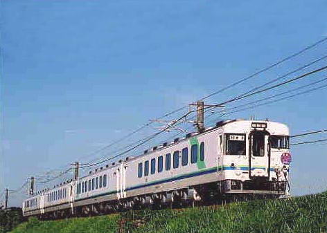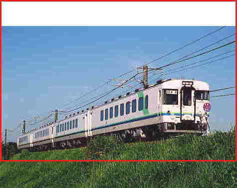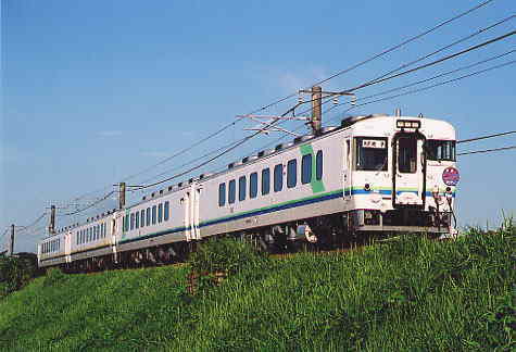 出雲市−直江間の出雲市側の土手で撮った写真です。 このポイントは、鉄橋を渡るところを撮った写真が良く雑誌に載ります。 しかし、この日はチョット場所を移動して土手を数メートル降りたところで撮りました。 はじめてローアングルから撮ってみました。 |