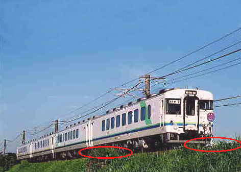 | 編成写真としてはとても良くまとまっていると思います。 ただし構図に少々難点があります。編成写真の場合、基本的にメインとなる車両は画面の下に来た方が、全体として落ち着いた構図になります。下の図を参考にして見てください。 あとできればですが、伸びている草を多少刈った方が車両の足回りがはっきりと見えて良かったかもしれません。 |